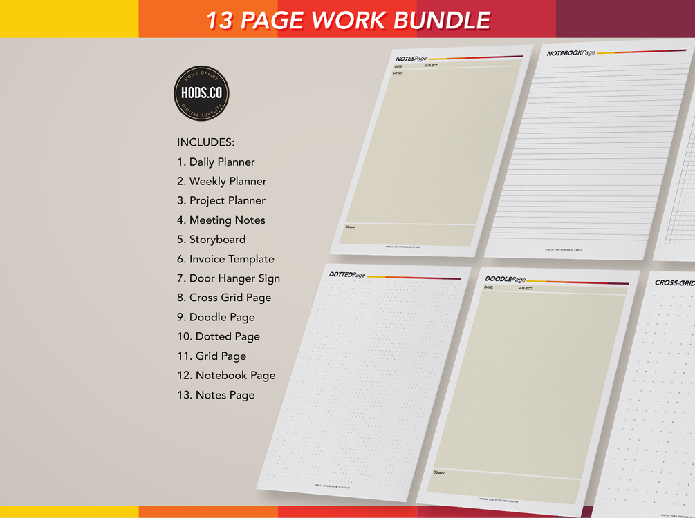 Daily Planner, Weekly Planner, Project Planner, Meeting Notes, Storyboard, Invoice Template, Door Hanger Sign, Cross Grid Page, Doodle Page, Dotted Page, Grid Page, Notebook Page, Notes Page